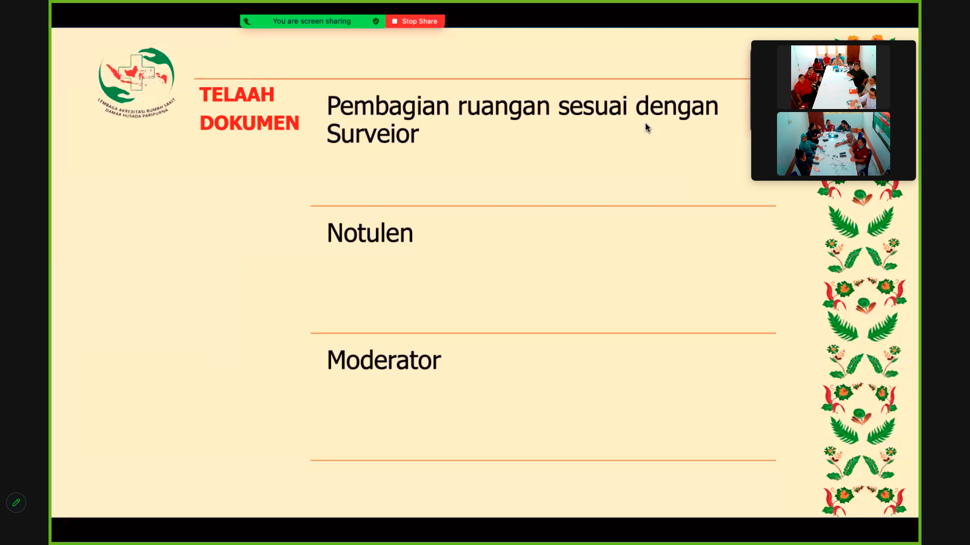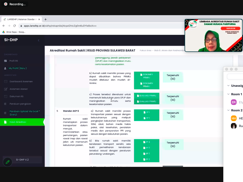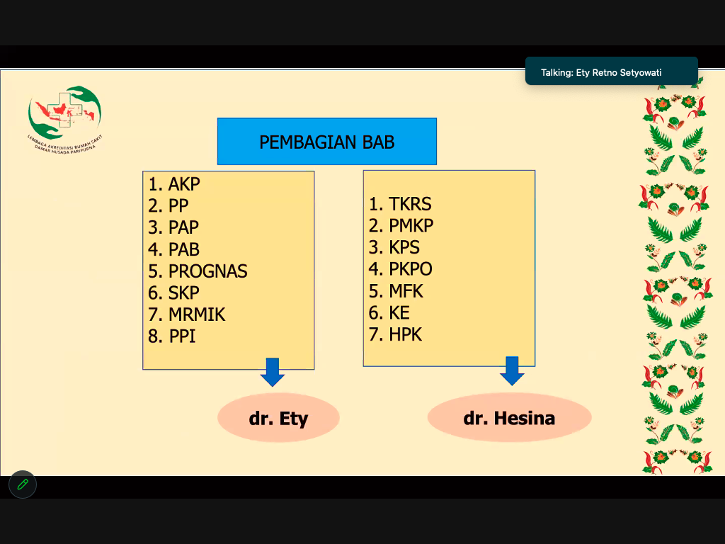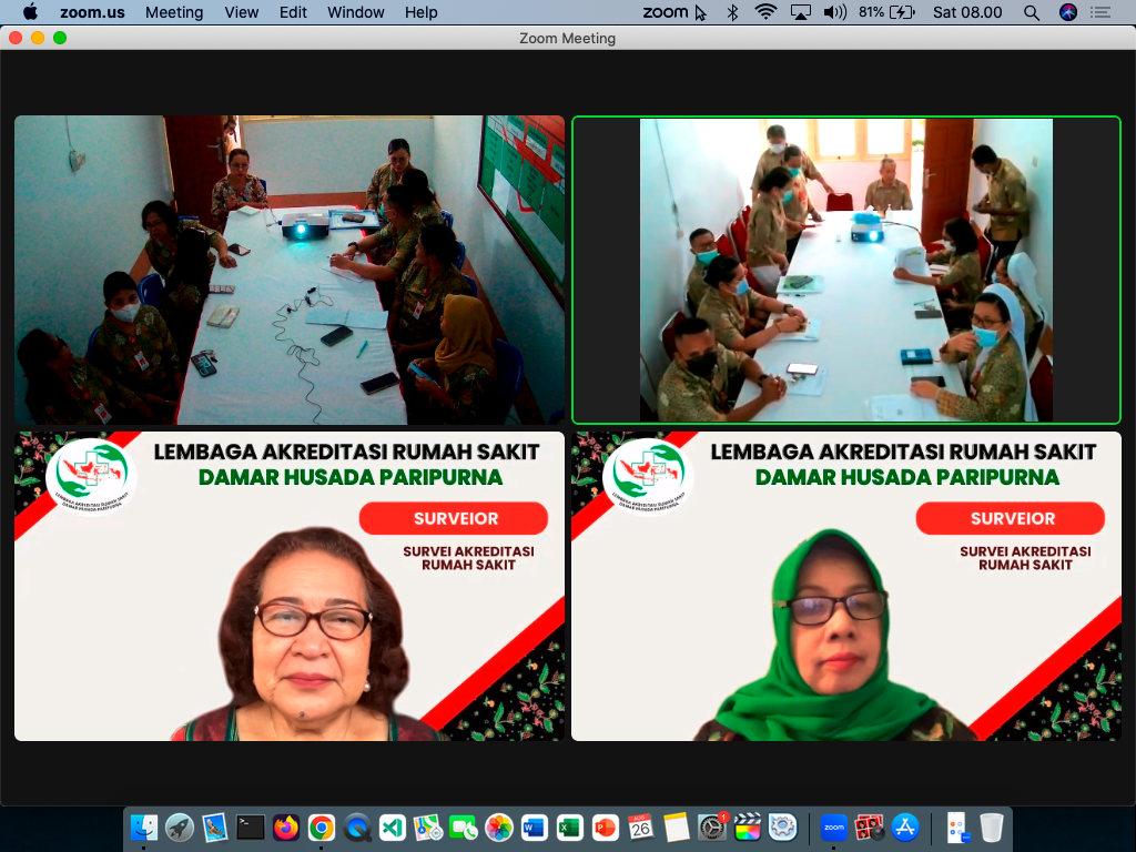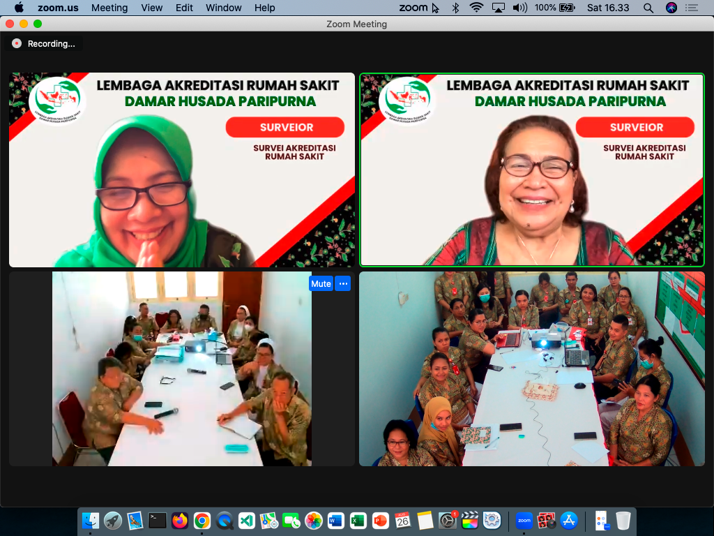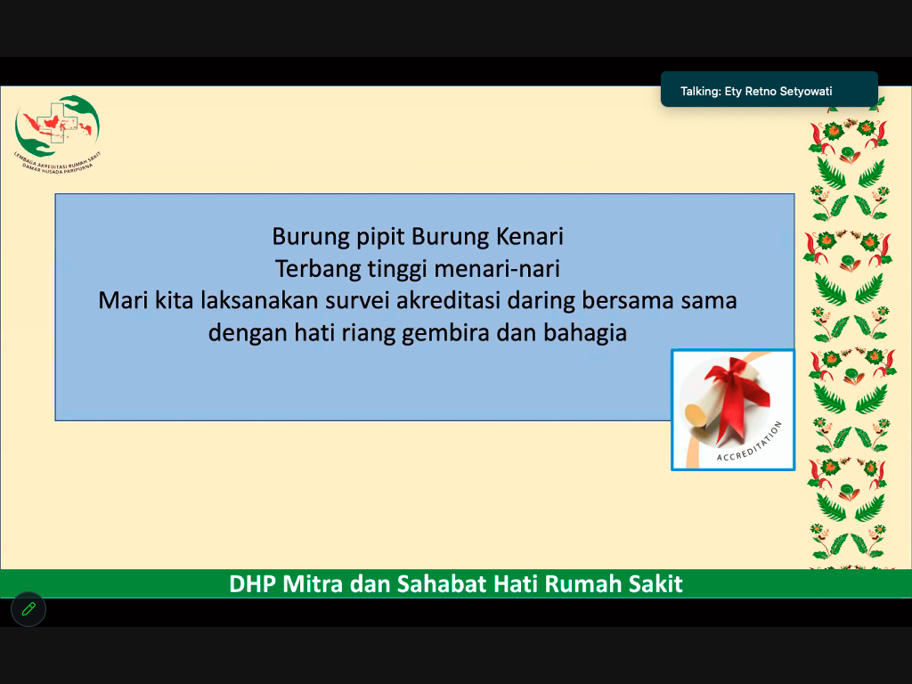 RSHATIVE.ORG. Akreditasi daring para surveior dengan keenambelas POKJA RS Hative telah dilaksanakan pada tanggal 25-26 Agustus 2023. Kegiatan akreditasi daring ini telah dilaksanakan dengan baik. Pada tanggal 25 Agustus 2023 dilaksanakan pertemuan hari pertama para surveior dengan POKJA RS Hative. Pertemuan daring ini berlangsung pkl. 12:00 sampai 15:00 WIT. Pada hari pertama ini, yang dibahas adalah perkenalan para suveior dan juga membahas technical meeting pada tanggal 26 Agustus 2023 sebagai hari kedua pelaksanaan kegiatan daring.